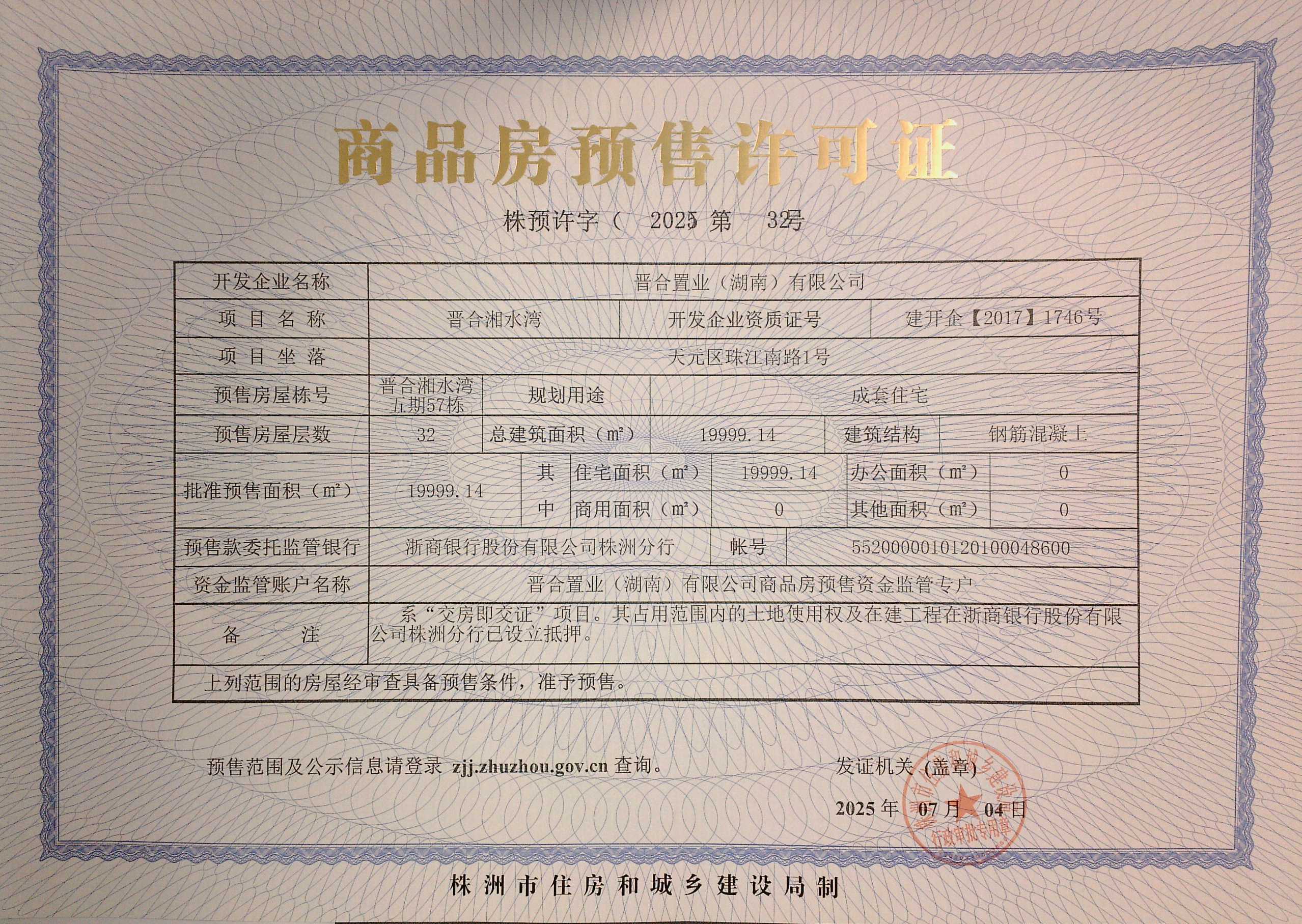 预许字(2025)第32号 | 2025-07-04 | 天元区衡山东路233号晋合湘水湾五期57栋 |