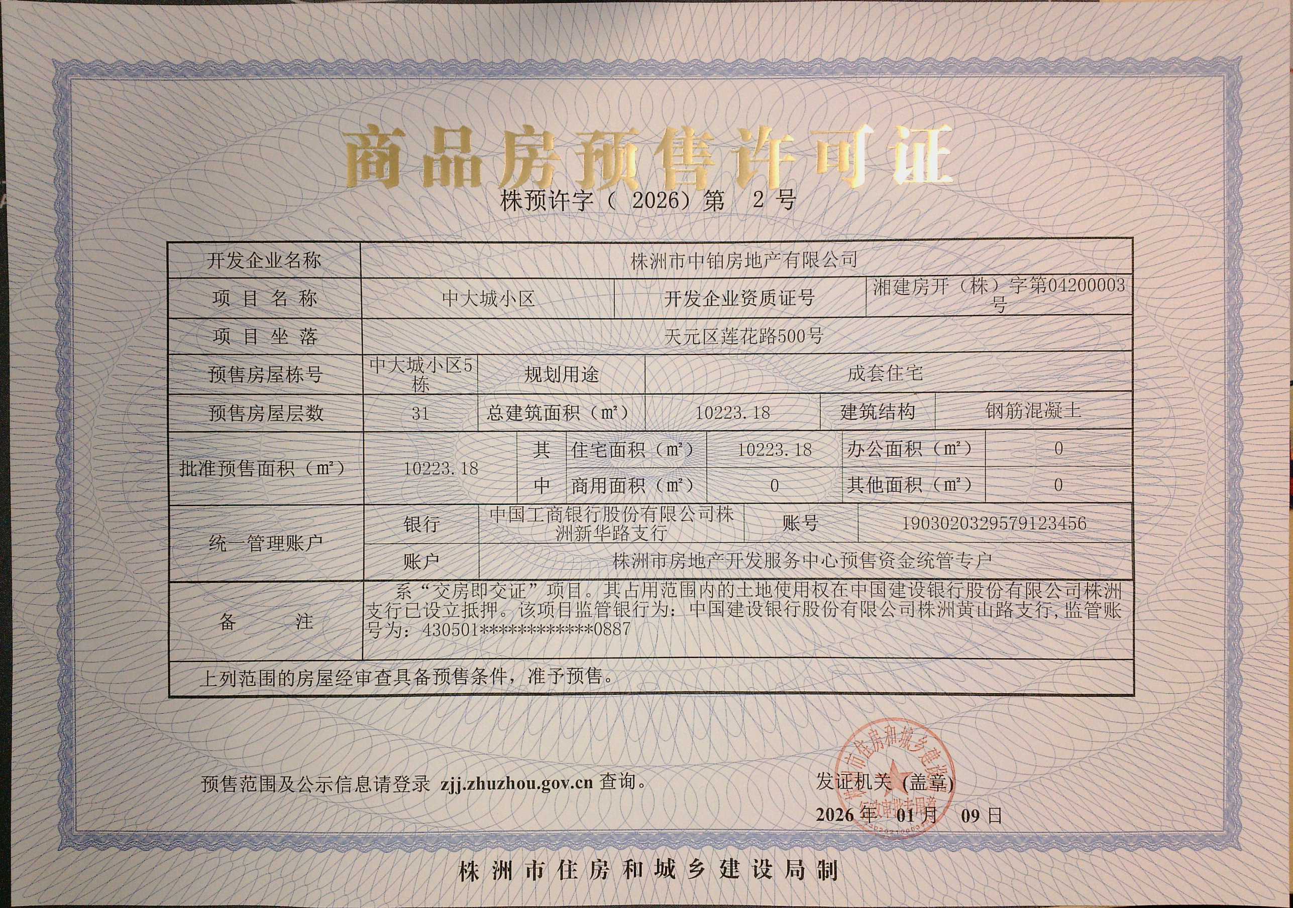 预许字(2026)第2号 | 2026-01-09 | 天元区莲花路500号中大城小区5栋 |