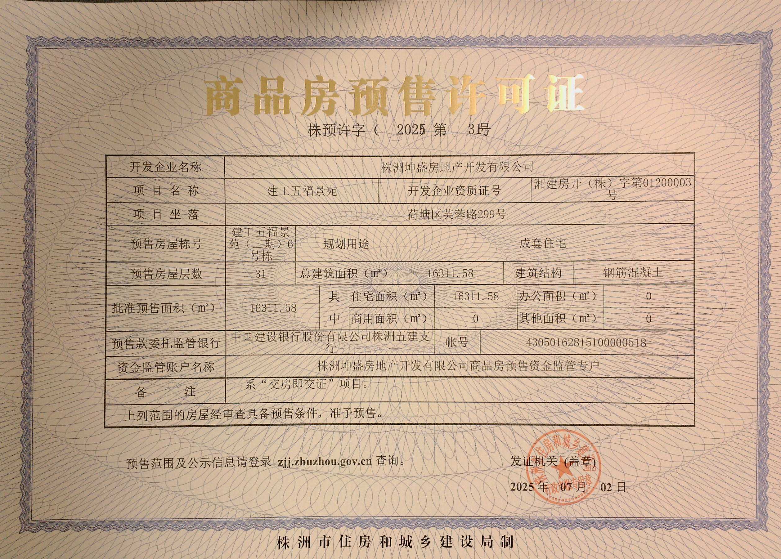 预许字(2025)第31号 | 2025-07-02 | 荷塘区芙蓉路299号建工五福景苑(二期)6号栋 |