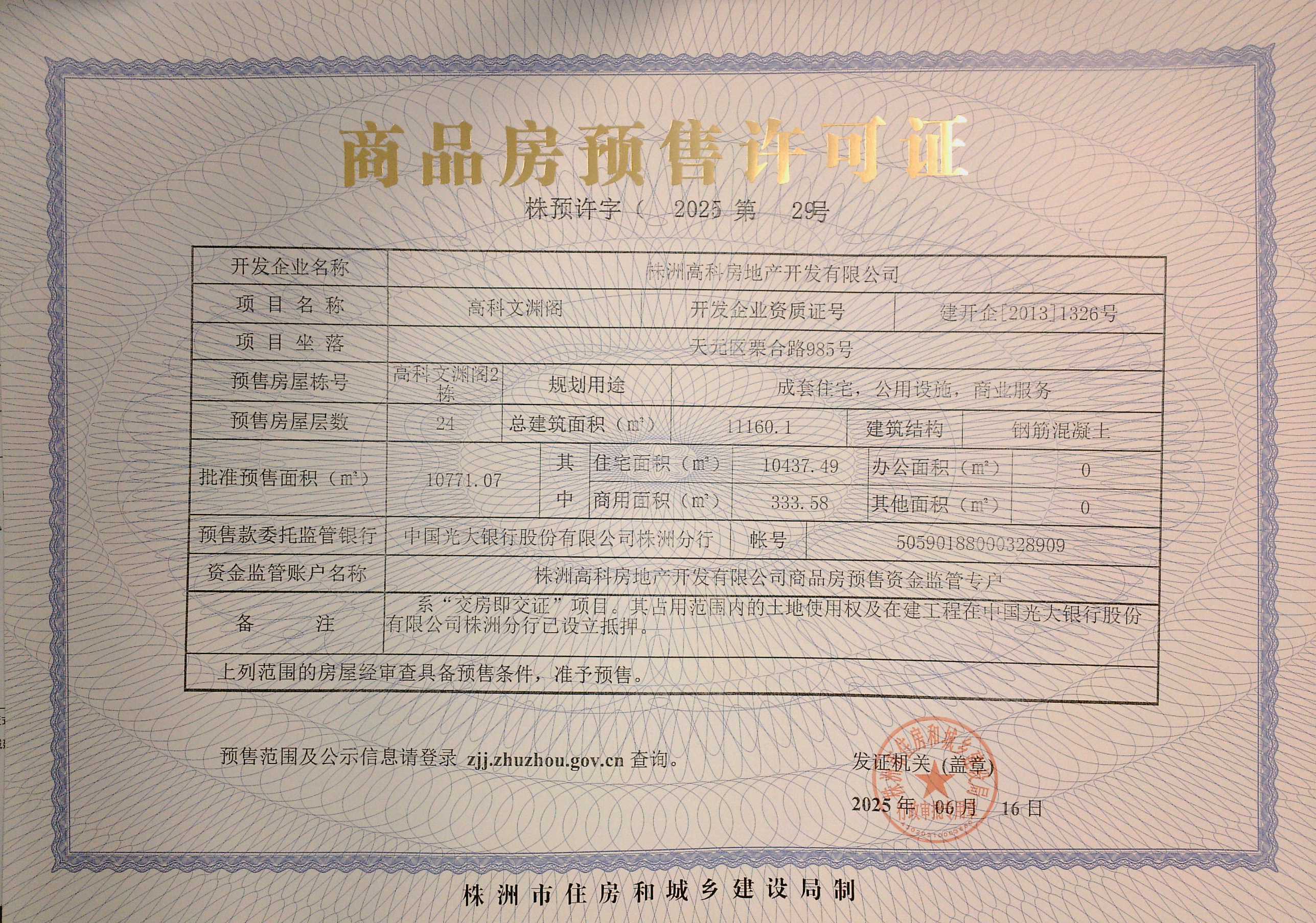 预许字(2025)第29号 | 2025-06-16 | 天元区栗雨街道王家坪社区栗合路985号高科文渊阁2栋 |