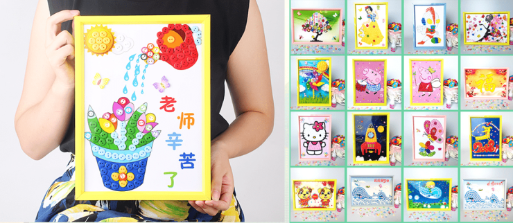 纽扣画制作的过程充满趣味,而且简单易操作。不用画笔、颜料,不用工艺、剪裁,只需要将一个个色彩斑斓的纽扣进行重新组合,拼摆成你喜欢的图案,一幅具有创意的立体画便跃然而生。
