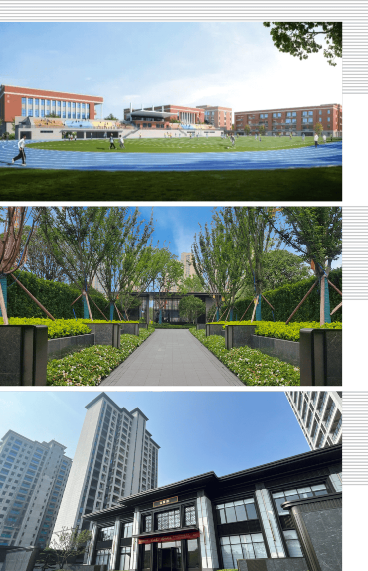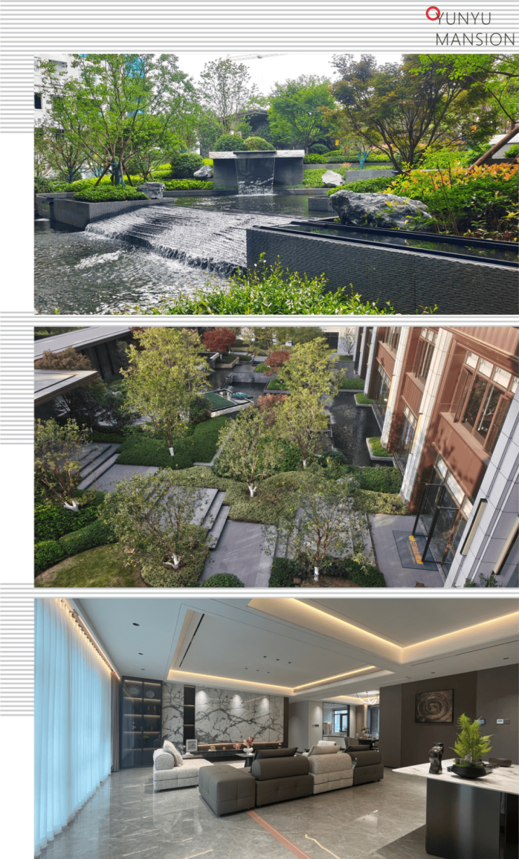 以东方礼序与自然诗意融合,打造三重山水、五进归家的园林格局。约35%高绿化率,形成“两轴三园七境”的景观体系。