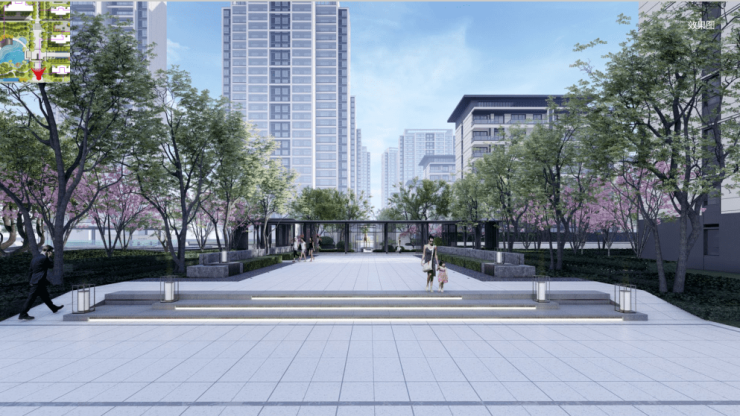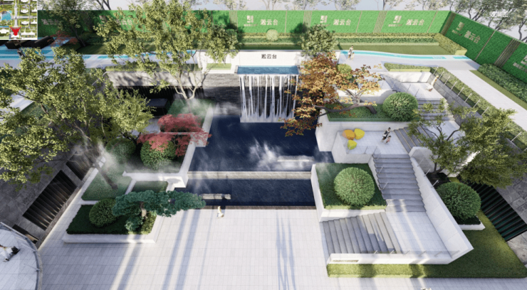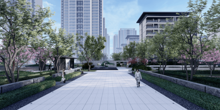 超400米中央景观轴,兼具仪式感和引导性,绿荫扶疏,繁花掩映,更为引人入胜;作为社区入口第一景的下沉式水瀑中庭,流水潺潺、寻循归家,正如诗人杜牧在《山行》中所作“远上寒山石径斜,白云深处有人家”,其设计灵感正是来源于此。穿过园林间约5米抬高的过道,阶梯抬高式的设计,开门迎客,谈笑鸿儒,更添一份江南水乡的诗情画意、内敛雅致之意。