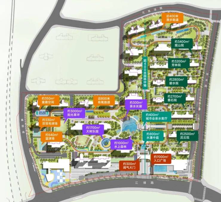 同时道路两侧也设置了层次丰富的景观组团,配以各自名贵花乔(如红枫、羽毛枫,紫薇、一叶樱、绚丽海棠等),通过乔木和灌木的巧妙搭配,按照时节而精心搭配,从第一天到每一年,臻造四时的风景始终盎然。