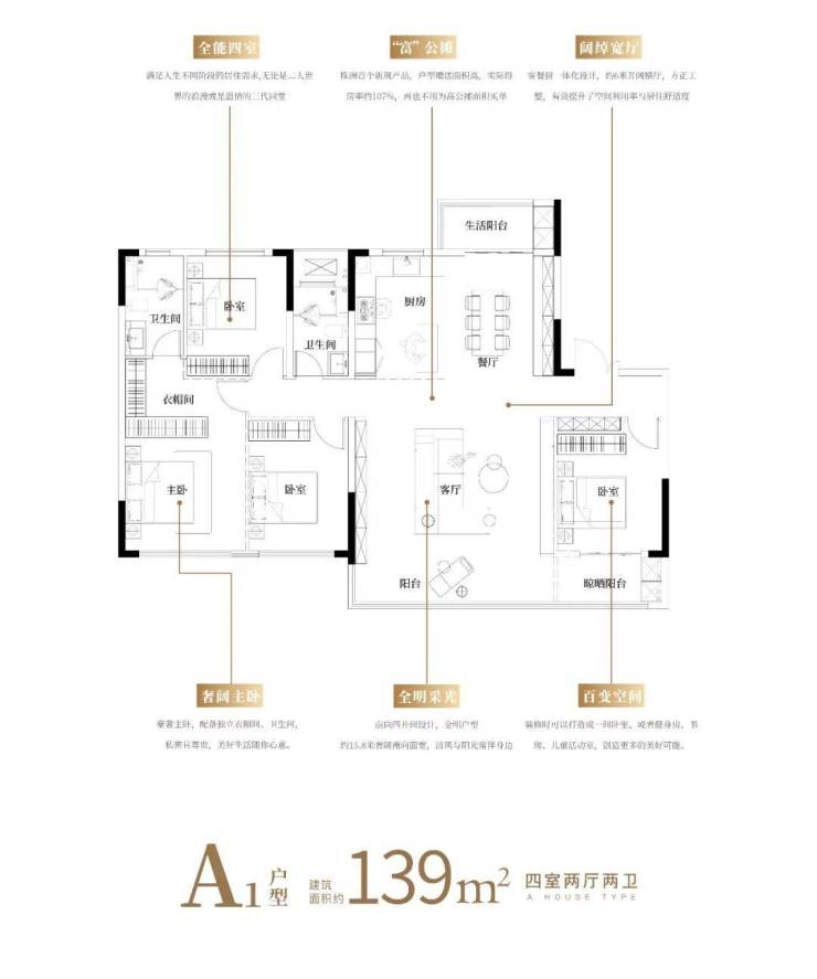 139㎡全能四房(建面):套内实得约150㎡,相当于旧规175㎡的使用空间,花少钱住大房的梦想直接实现!