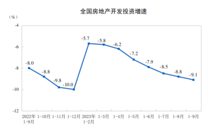 国家统计局数据显示,1-9月份,全国房地产开发投资87269亿元,同比下降9.1%(按可比口径计算);其中,住宅投资66279亿元,下降8.4%。
