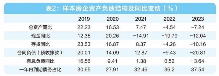 从负债端来看,2023年样本房企有息负债总额5.07万亿元,同比减少3.64%(表2)。在融资收紧的背景下,房企首次压降了负债规模,七成以上房企实现“减负”。龙头房企中,金地集团、滨江集团有息负债降幅超过20%。