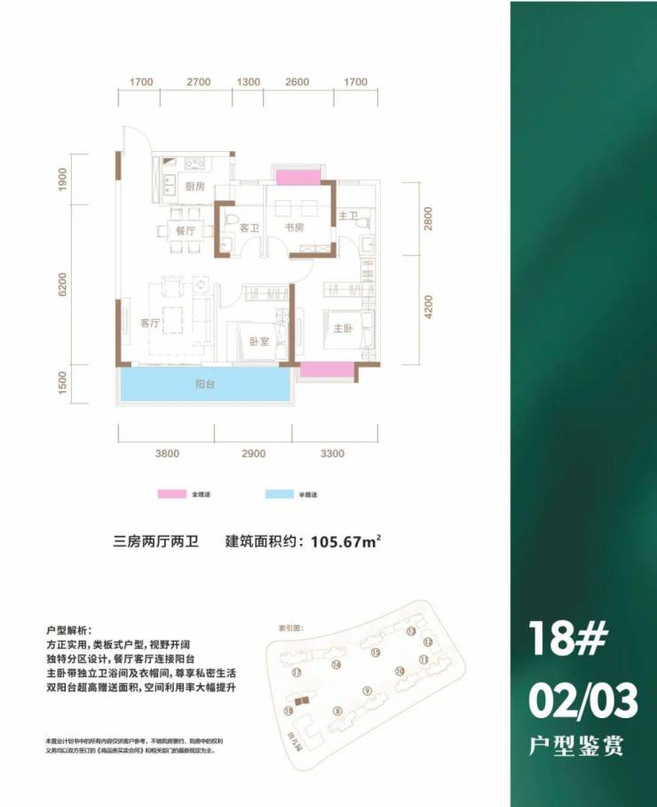 其中建面约105㎡户型,采用三房两厅两卫设计,南北通透,户型十分方正,面积段适中,上车门槛十分友好,性价比超高。