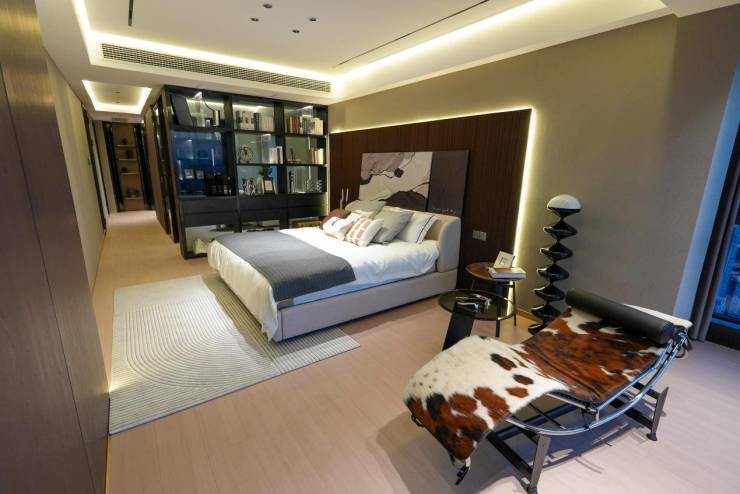 值得一提的是,客厅连接着一个8米宽、270º观江阳台。在这里,浩瀚江景毫无保留地铺展在眼前,视野极其开阔。无论是清晨欣赏江面上的第一缕阳光,还是傍晚观赏绚丽的晚霞,都无比惬意。闲暇时,摆上几把躺椅,泡上一杯香茗,尽享悠闲时光。