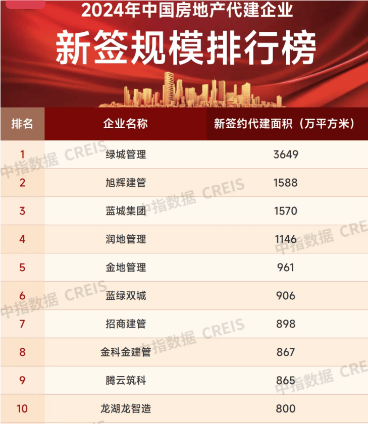 另据中指研究院数据,2024年,绿城管理、旭辉建管和蓝城集团分别以3649万平方米、1588万平方米和1570万平方米的新签约规划建筑面积排在行业前三位。