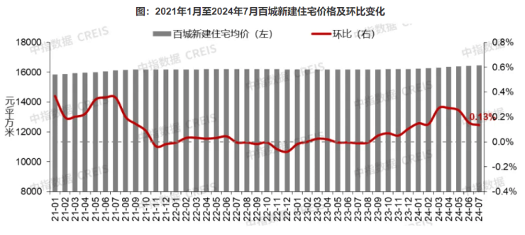中国房地产指数系统百城价格指数显示,7月全国100个城市新建住宅平均价格为16443元/平方米,环比上涨0.13%,涨幅较6月收窄0.02个百分点。二手住宅方面,以价换量趋势延续,百城二手住宅价格连续27个月下跌至均价14653元/平方米。