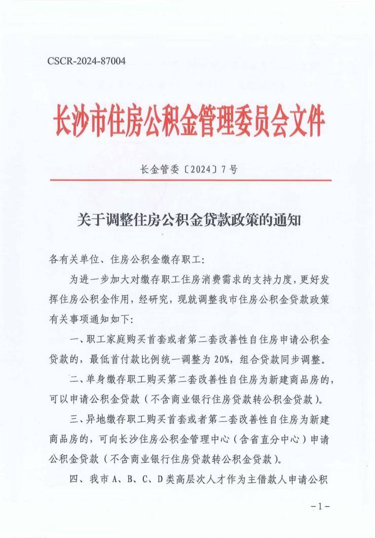 长沙:首套或第二套改善性自住房申请公积金贷款最低首付调为20%