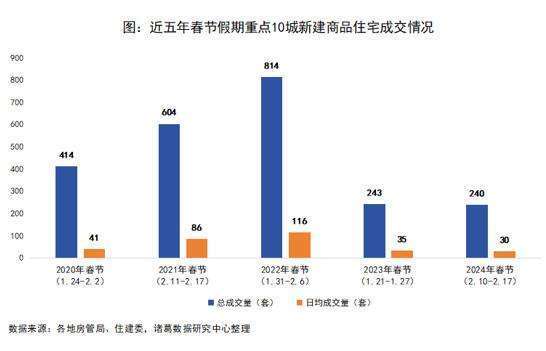 对于今年春节新房成交冷淡的原因,诸葛数据研究中心认为,一方面,2024年春节假期期间出游热情依旧高涨,或在一定程度上导致购房需求释放滞缓,经文化和旅游部数据中心测算,2024年春节假期8天全国国内旅游出游4.74亿人次,同比增长34.3%,并且今年春节出游人次创2019年以来新高;另一方面,当前市场信心仍在缓慢修复,同时新房交付风险压力或持续影响成交周期,购房观望情绪犹存。