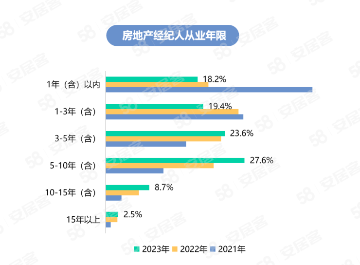 当前经纪人群体表现出相对较高的职业稳定性。《报告》显示,2023年参与调研的经纪人中,有27.6%的经纪人已从事经纪行业5-10年,从业3年以上的经纪人增长明显,占比为62.4%,与去年相比增长9.1个百分点。