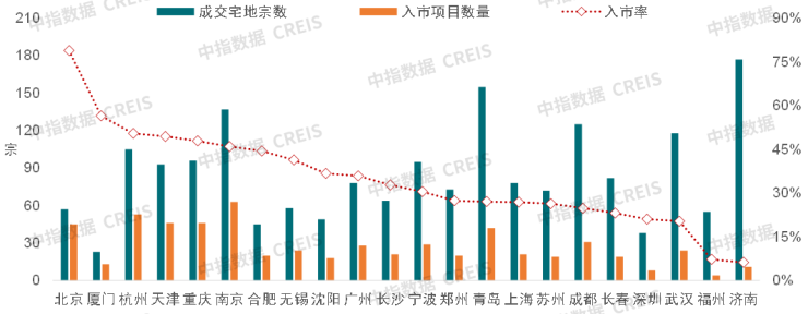 中指研究院报告显示,22城中3个城市入市率超五成,北京、杭州等城市推盘积极性相对较高。