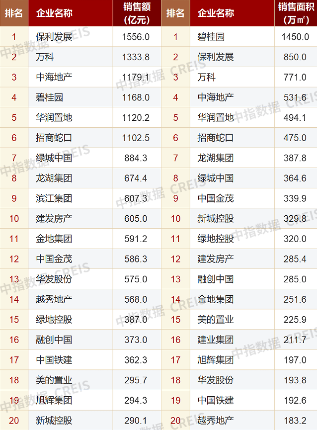 2023年1-4月房企销售金额和面积TOP20 来源:中指研究院