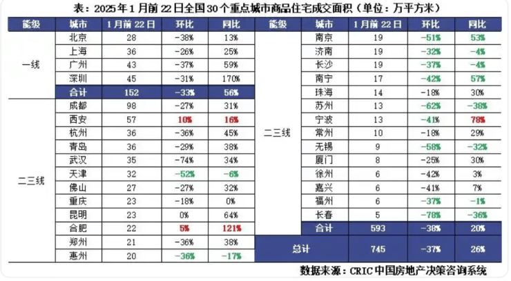 值得一提的是,1月重点城市二手房市场相对新房表现依然更好。克而瑞监测显示,1月前22日,33个重点城市二手房成交面积预计为1346万平方米,环比下降19%,同比增长19%,涨跌幅均小于一线,延续高位震荡行情。