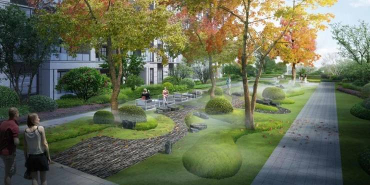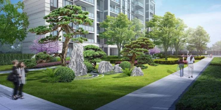 墅质洋房住区,营造递进式归家院落,以“云纹”状灌木和铺装陈设的流云院,旱溪引路,借以奇石堆叠搭配的叠石院,“涌泉”相伴奇巧质朴的碧水院,“绿岛”之上芳林环绕的芳林院,以“假山”小景勾画山峦之美的揽山院,层叠错落、蜿蜒曲折的游园动线,景随身移,随手一拍都是出圈之作。