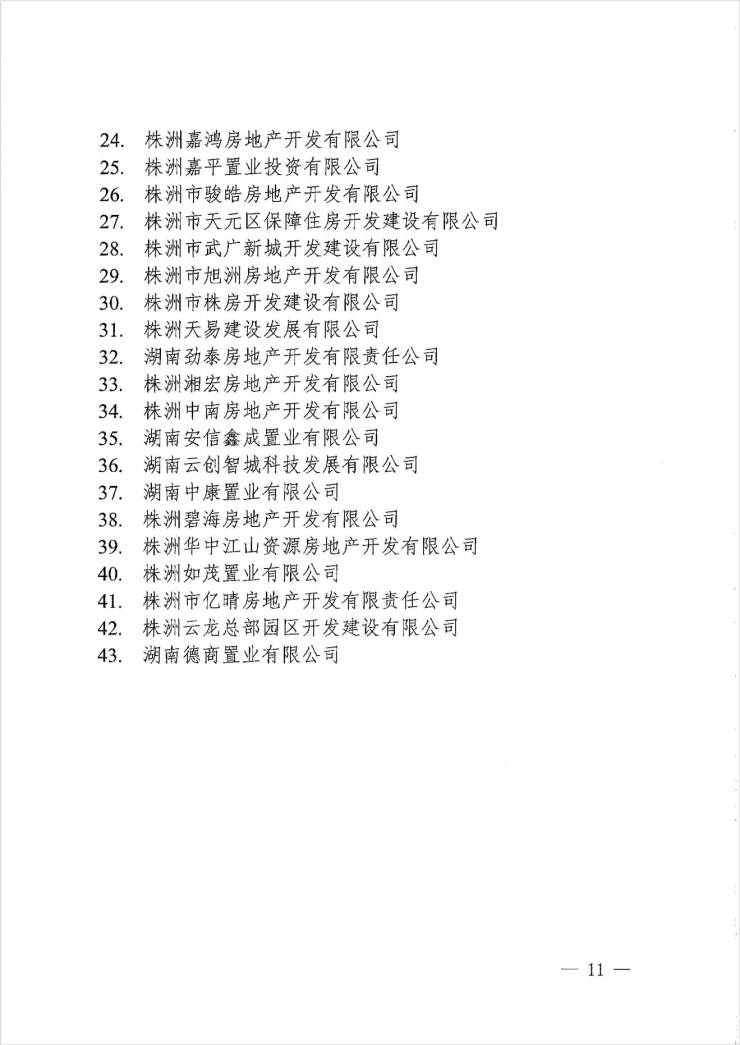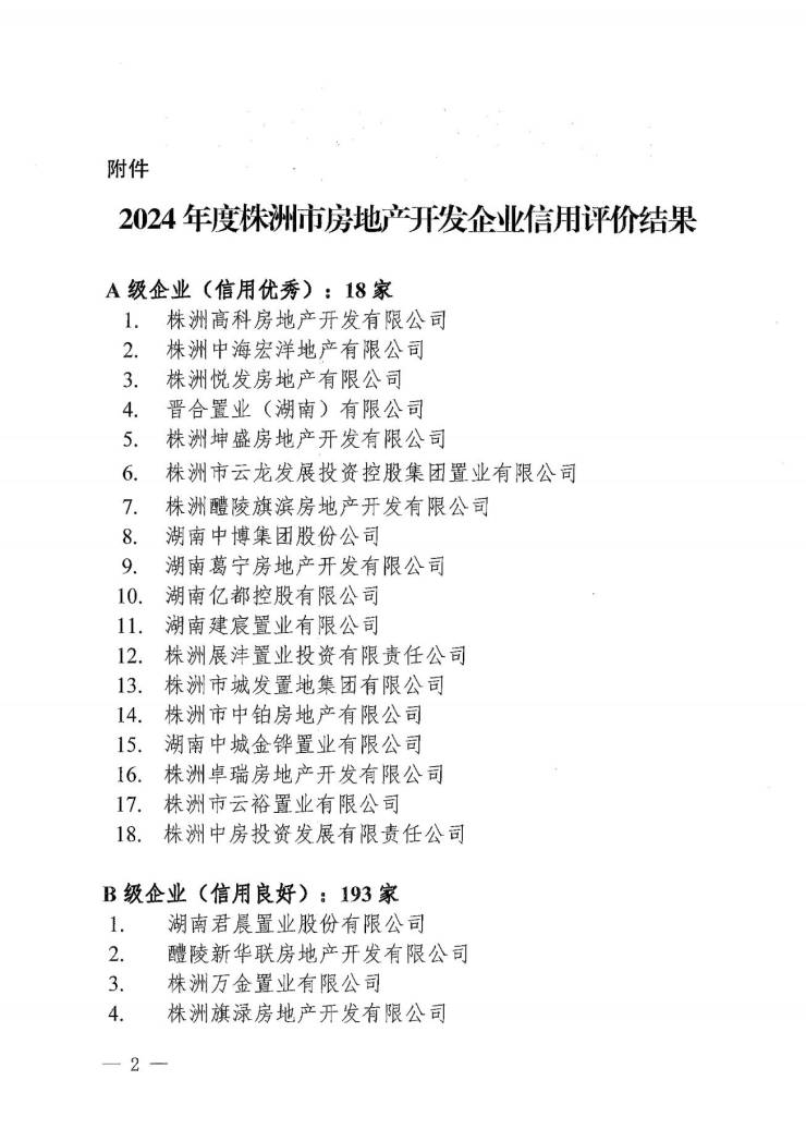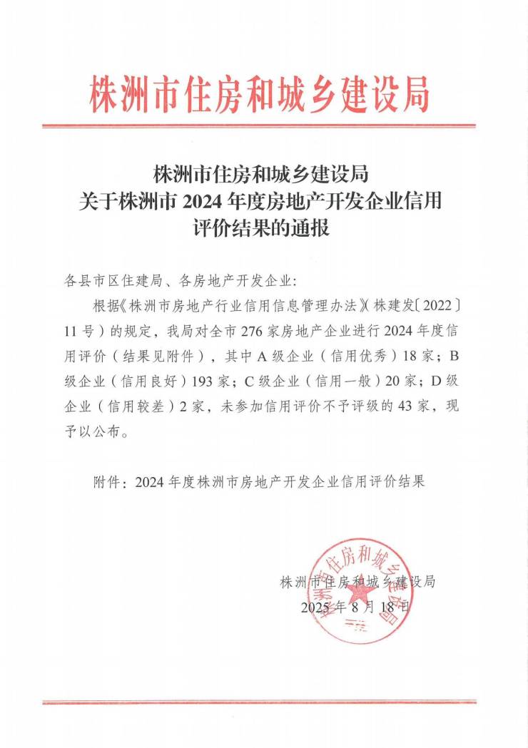 株洲市住建局通报 2024 年度房地产开发企业信用评价结果