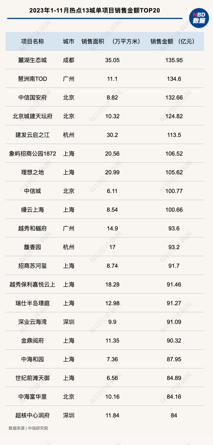 前11个月,全国13个热点城市诞生了9个百亿大盘,分别是成都麓湖生态城,广州琶洲南·TOD,上海象屿招商公园1872、理想之地、缦云上海,北京城建天坛府、中信国安府、中信城,杭州建发云启之江。