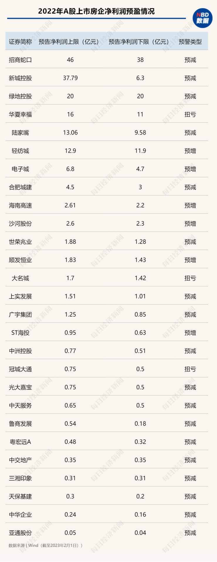 不过,尽管过半房企业绩预亏,但也有如大名城、华夏幸福、冠城大通等房企实现扭亏为盈。中指研究院企业研究总监刘水2月1日在接受《每日经济新闻》记者微信采访时表示,“随着政策支持力度加大,今年房地产市场将筑底回稳。尽管房企盈利压力仍在,但较2022年或将有所缓解。”