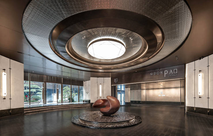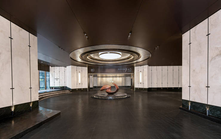 中央车站的设计,兼具实用性与仪式感。地面落客区采用马蹄石铺设,防滑耐磨且纹理美观,泛着温润的光泽;墙面选用仿玉石材质,质地细腻、易于打理,搭配牡丹花对景雕塑,寓意 “富贵吉祥”,让落客区成为株洲建发瑞云一道赏心悦目的风景。地库车马厅以铝合金格栅吊顶,搭配连纹岩板,地面采用金刚砂无机固化地坪,不仅美观大方,还具有高强度、抗磨损、易清洁的特点,让株洲建发瑞云的地库告别阴暗潮湿与灰尘。