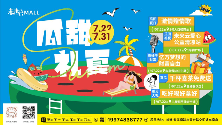 我们希望通过这样的方式为城市一线劳动者送上‘夏日关怀’,他们挥洒汗水、坚守岗位,他们与骄阳同行,与高温相伴,依然在烈日下奔波、劳作,为城市繁荣发展,环境整洁舒适,道路通畅默默奉献,为文明城市创建挥洒着辛勤汗水,他们,是这个夏天最可爱、最可敬的人!帮助他们消暑降温、安心工作。这次的 “爱心清凉站”免费为在户外劳动者提供冰棒、冰水、冰西瓜,让不辞劳苦为城市发展作贡献的户外劳动者们热有场所纳凉、渴有饮水供应、累有站点歇脚。 同时未来云MALL也在开展“瓜甜礼夏,全城吃瓜”活动,如:《千杯喜茶免费送》餐饮消费满额送西瓜或喜茶,瓜分大礼!吃好喝好赢大奖,瓜田夏日!激情赠情歌(音乐会),听歌吃瓜拿礼品等等。