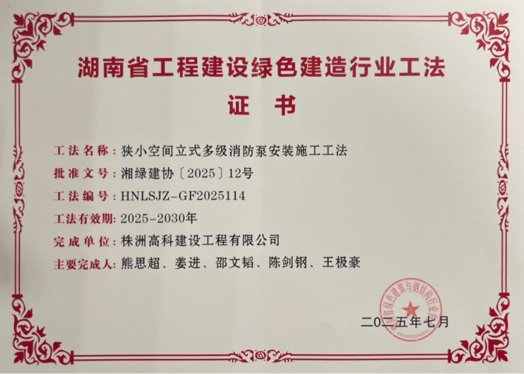 在科技创新领域,文渊阁项目同样表现亮眼:《降低全砼外墙门窗洞口裂纹的频次》课题荣获"湖南省QC成果二等奖";《狭小空间立式多级消防泵安装施工工法》获评"2025年度湖南省工程建设绿色建造行业工法"。两项技术突破不仅解决了行业常见难题,更为项目质量提供了坚实的技术保障。