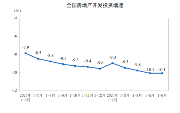 在房地产开发投资完成方面,国家统计局发布数据显示,1-6月份,全国房地产开发投资5.25万亿元,同比下降10.1%。其中,住宅投资约3.99万亿元,同比下降10.4%。