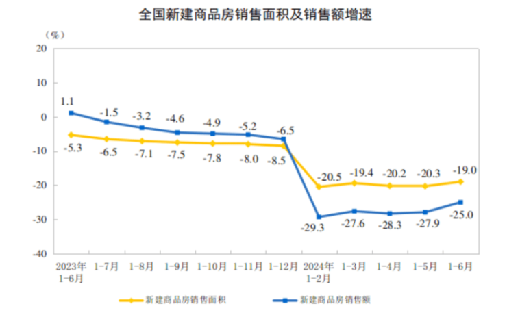 在新建商品房销售和待售方面,国家统计局发布数据显示,1-6月份,新建商品房销售面积4.79亿平方米,同比下降19.0%,其中住宅销售面积下降21.9%;新建商品房销售额约4.71万亿元,同比下降25.0%,其中住宅销售额同比下降26.9%。截至6月末,商品房待售面积约7.39亿平方米,同比增长15.2%,其中住宅待售面积同比增长23.5%。