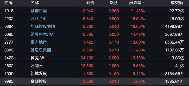 港股方面,截至收盘,融创中国涨超21%,万科企业涨幅在16%以上,旭辉控股、绿景中国、富力地产、贝壳等6只股票涨幅在10%以上。新城发展、龙湖集团、华润置地、中国金茂、龙光、越秀地产等亦录得5%以上的涨幅。整体来看,地产建筑业板块涨幅约4.3%,领涨各大板块。