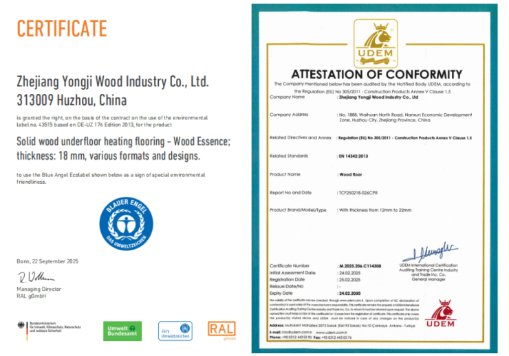 作为全球首个且最严苛的环保认证体系,其对有害物质释放、生产过程环保性的检测标准远超普通行业规范,至今仍是诸多企业难以突破的技术壁垒。而永吉“农夫山林”系列,正是地板行业首家斩获此项认证的产品。”蓝天使认证的审核涵盖从木材采伐到成品回收的全生命周期,每一项指标均需通过第三方权威机构的持续溯源检测,这份认证不仅是对新品环保实力的极致认可,更标志着中国地板在环保领域达到了国际顶尖水平。