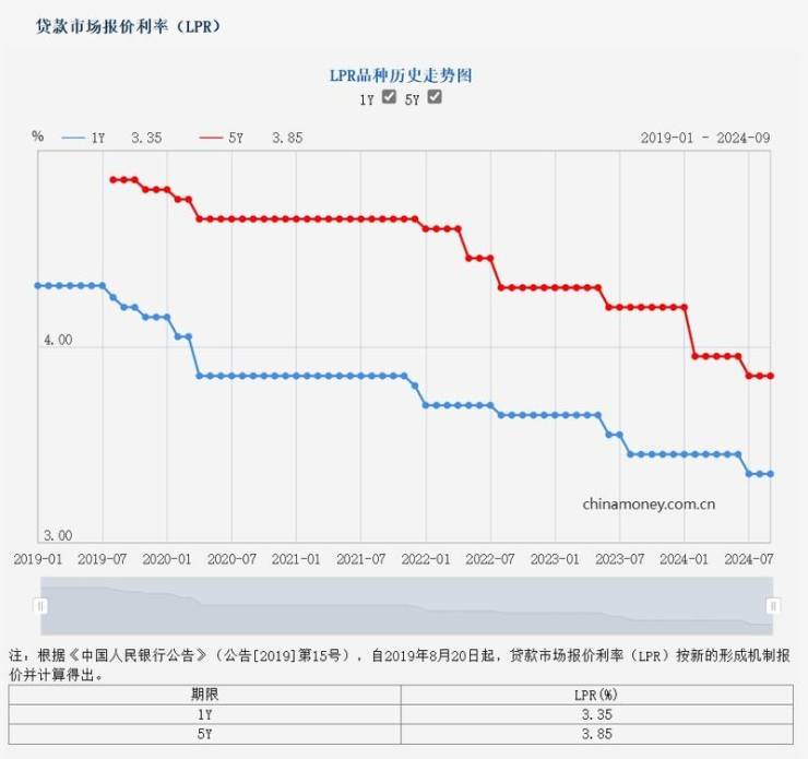 9月20日,中国人民银行授权全国银行间同业拆借中心公布,2024年9月20日贷款市场报价利率(LPR)为:1年期LPR为3.35%,5年期以上LPR为3.85%,与8月份持平。