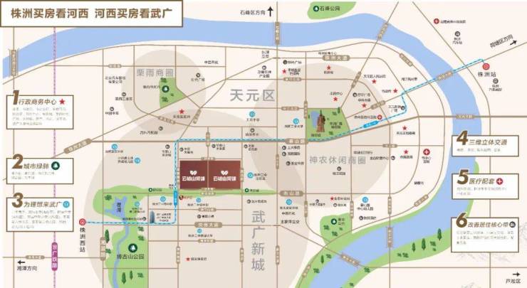 1、城市主干道:项目旁边已形成三横(炎帝大道、衡山西路、泰山路)三纵(西环线、栗合路、栗雨路)市政道路交通网络,城际商务出行、休闲旅行都可以快速通达。