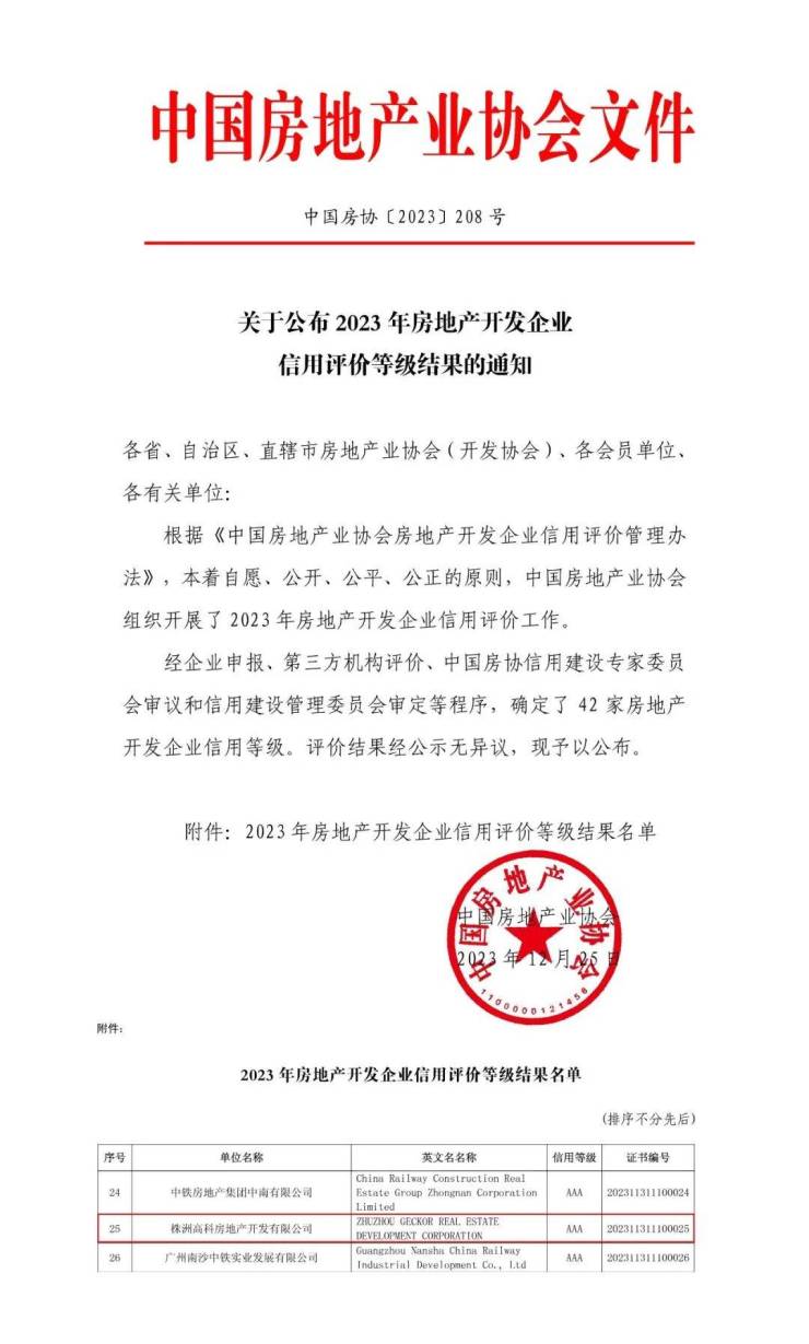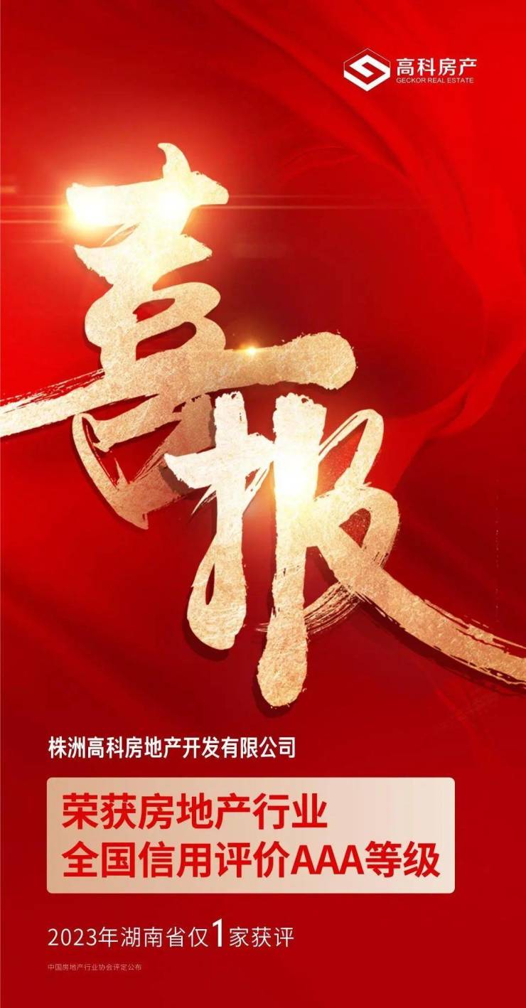 12月25日,中国房地产业协会对2023年房地产开发企业信用评价等级结果进行了公布。2023年全国房地产开发企业获得信用等级共有42家。株洲高科房地产开发有限公司凭借良好的经营状况、优秀的信用记录及优质的服务能力,获得信用评价AAA级等级。