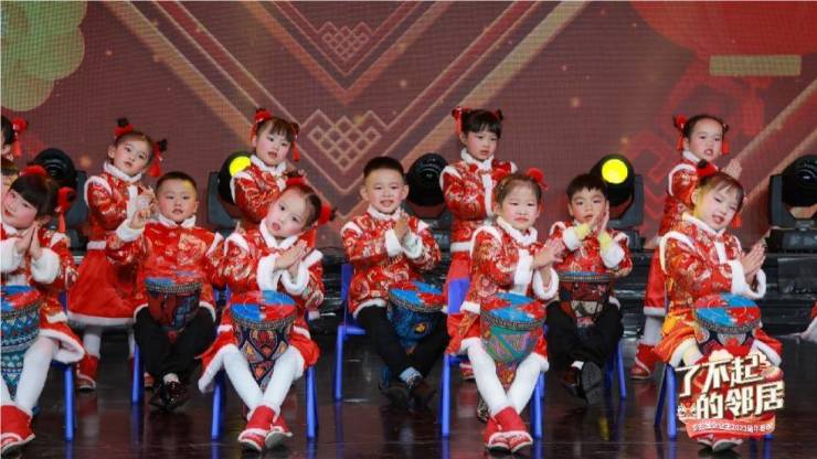 拜年是中国民间的传统习俗,是人们辞旧迎新、表达美好祝愿的一种形式。因此节目开场,来自美的鹭湖配套幼儿园——美鹭幼儿园的29名小朋友,为大家带来了滑轮与非洲鼓的创意串烧,用成语传递祝福,童真童趣的舞台表演,展现了美的鹭湖亲子社群不一样的活力。