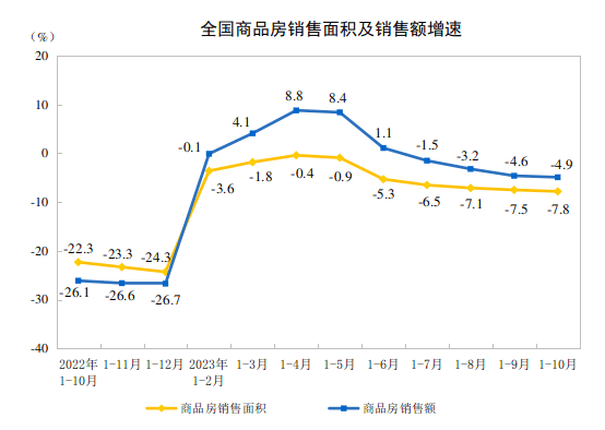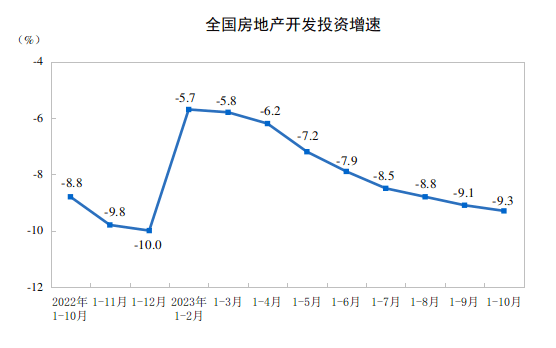 11月15日,国家统计局发布2023年1-10月份全国房地产市场基本情况。今年1-10月份,全国房地产开发投资约9.59万亿元,同比下降9.3%;全国商品房销售额约9.72万亿元,同比下降4.9%。尤其是在月度销售指标上,在9月边际改善后,10月再度滑坡。